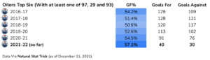 Edmonton’s top-six has been very strong this season, posting better results than in each of their previous five years. Zach Hyman has been a welcome addition, while Jesse Puljujarvi continues to improve. Based on this, the team’s overall 5v5 goal share should also be near the highest it’s been.