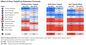 One reason for Edmonton’s decline in 5v5 play under Tippett? Edmonton’s depth forwards – an issue that’s seemingly never-ending.