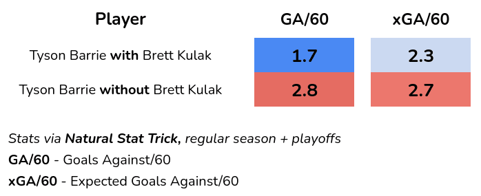 In a sample of 347 regular-season and playoff minutes, Barrie and the Oilers allowed a substantially lower number of goals and chances with Kulak on-ice, as opposed to without.
