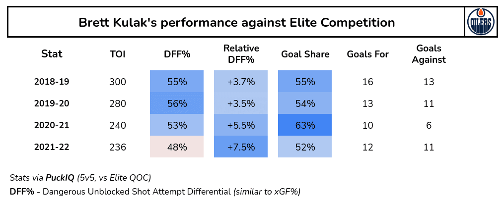 PuckIQ splits quality of competition into three tiers of players; elite, middle and gritensity. Here’s how Kulak performs against elite competition.