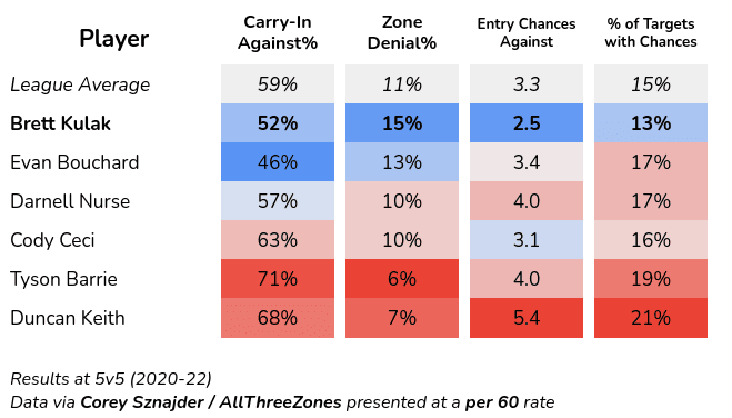 This is precisely why I was a vocal advocate for Kulak to play more ice-time in the playoffs. Nurse played with a torn hip flexor, and Keith’s inefficiencies at defending the entry continued; an alarming 72% of Keith’s entry targets against led to clean, controlled zone entries.