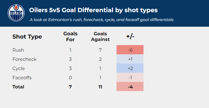 They’ve allowed one goal off a faceoff, but they have a +1 differential in forecheck goals (three for, two against), and a +2 differential in cycle goals (three for, one against). There’s been much discussion regarding Edmonton’s defensive zone system and how they’ve switched from an aggressive man-to-man system to a more passive box plus one, but their in-zone defending isn’t actually killing them in terms of directly causing goals against.
