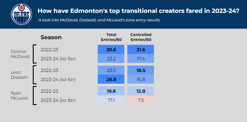 Last year, Edmonton’s three primary creators in transition were their three primary centres: McDavid, Draisaitl and McLeod. How have they fared in transition this year?
