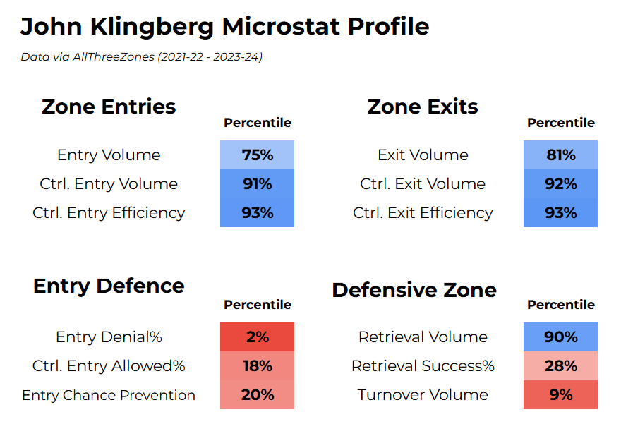 But, we can also see what makes Klingberg a weak defensive player. Klingberg is practically an open door in terms of allowing zone entries, as he almost never stands up the blueline. This results in opposition forwards often burning Klingberg in transition and generating high-quality rush chances. Additionally, Klingberg does retrieve loose pucks in the defensive zone at high volumes, but the problem is, he struggles to consistently move the puck without giving it up; his turnover volume in his own zone ranks at a dreadful 9th percentile.