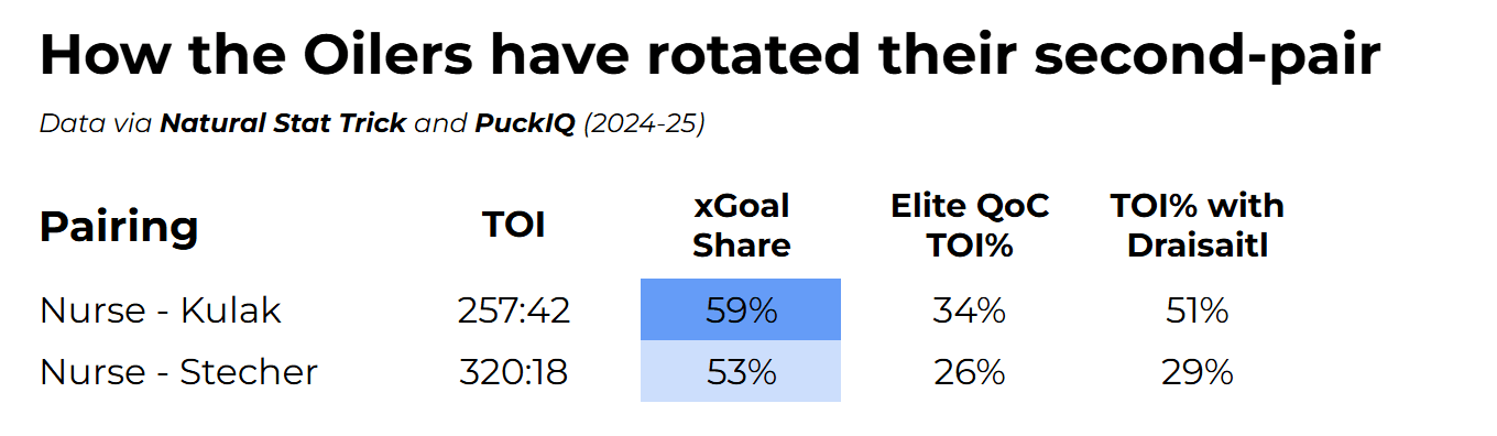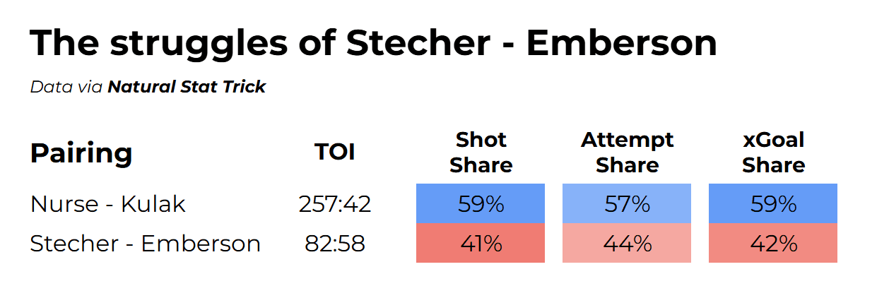 That being said, are there still risks to this deployment? Absolutely. Even with the most optimal deployment possible, Nurse – Klingberg could remain vulnerable to ill-advised pinches or turnovers in the OZ leading to a quality chance the other way. Furthermore, there have been times this season when Ekholm – Bouchard played one shift, and Nurse – Kulak received the subsequent shift, causing Stecher – Emberson to occasionally play the next one; when they have, their results are not pretty.