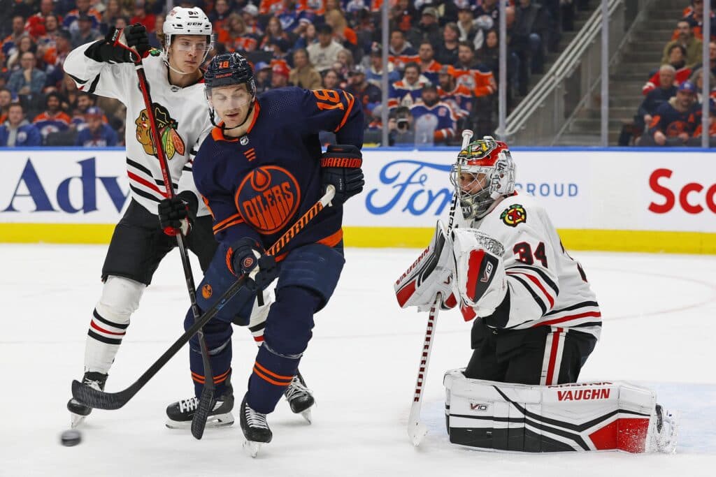 Jan 25, 2024; Edmonton, Alberta, CAN; Edmonton Oilers forward Zach Hyman (18) tries to deflect a shot on Chicago Blackhawks goaltender Petr Mrazek (34) during the first period at Rogers Place. Mandatory Credit: Perry Nelson-USA TODAY Sports