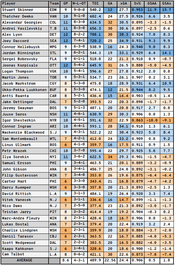 Here’s a look at Skinner’s January numbers against all goaltenders who played six or more games.