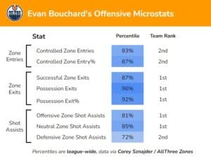 Bouchard ranks second among Edmonton’s defence core in controlled zone entries per 60, and controlled entry%, behind Darnell Nurse in both facets. By a considerable margin, Bouchard is Edmonton’s best defender at zone exits, ranking in the 96th percentile in possession exits per 60, and in the 92nd percentile in possession exit efficiency. Bouchard’s shot assist totals are exceptional as well. He’s excellent at transporting and moving the puck throughout all three zones.