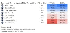 The Oilers also allowed fewer chances with Bouchard on-ice in the playoffs as opposed to without. Bouchard’s goal differential was subpar, but this was largely due to poor goaltending — Bouchard’s on-ice SV% was merely 0.885.