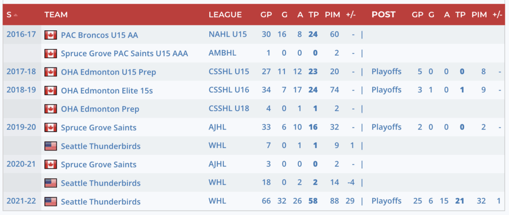 Schaefer scored zero goals and three points across his first 25 games in the WHL before breaking out with 32 goals and 58 points for the Seattle Thunderbirds in 2021-22. He also added six goals and 21 points in 25 playoff games as the Thunderbirds lost to the Edmonton Oil Kings in the WHL Final.