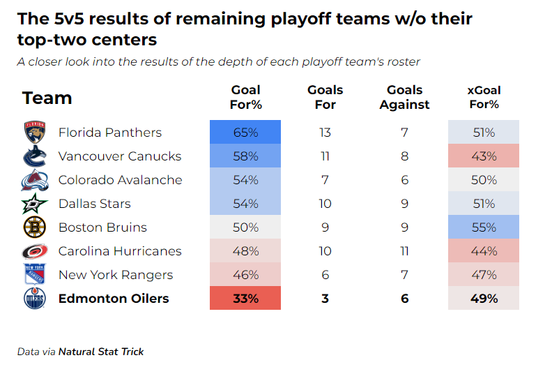 Of the eight teams that reached the second round, here is a look at their goal and expected differential without their top two centers: