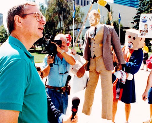 Pocklington was burned in effigy outside of Northlands Coliseum…