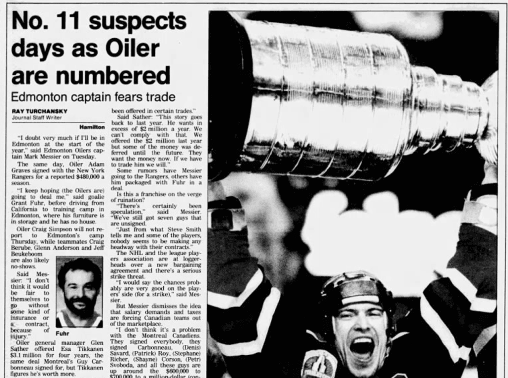 Paul Coffey went first, Wayne Gretzky was sold a year later, and then, a couple of years after winning the 1990 Stanley Cup, the exodus continued with Jarri Kurri spending a year in Europe before eventually joining Gretzky in L.A. and Grant Fuhr and Glenn Anderson getting shipped to Toronto. The final blow came days before the beginning of the season when Mark Messier got dealt to New York.