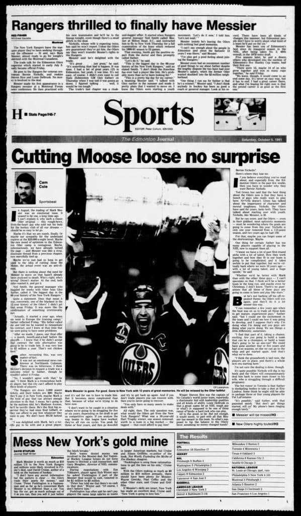 “Bernie Nicholls? Here’s where they lose me. If you believe everything you’ve read about, and especially from, the Edmonton Oilers in the past few weeks, then you have to wonder why they want Bernie Nicholls. (Oilers coach) Ted Green has said that the best thing about the Oilers now is that they have a bunch of guys who really want to play here. Nicholls doesn’t. Green has talked about the importance of character and mental toughness. Nicholls, the Oilers have said for years, lacks both. They have talked about starting over with youth. Nicholls, like Messier, is 30.”