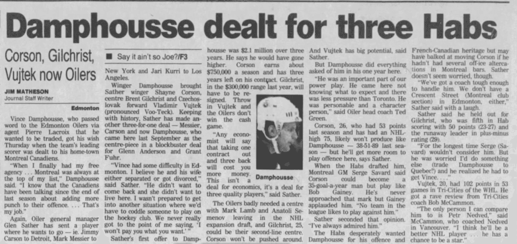 Unfortunately, that would be the end of Damphousse’s career as an Oiler. In the off-season, Damphousse got dealt to the Montreal Canadiens along with a fourth-round pick for Shayne Corson, Brent Gilchrist, and Vladimir Vujtek.
