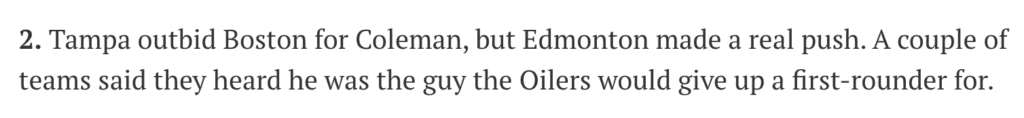 Coleman will be a UFA at the end of next season but Holland was probably interested in him because his cap hit is only $1,800,000. Would the Oilers be willing to give up a 1st rounder for a player in the three to five million range? They would have to send @Sam Gagner or @Kris Russell back the other way but it may be possible.