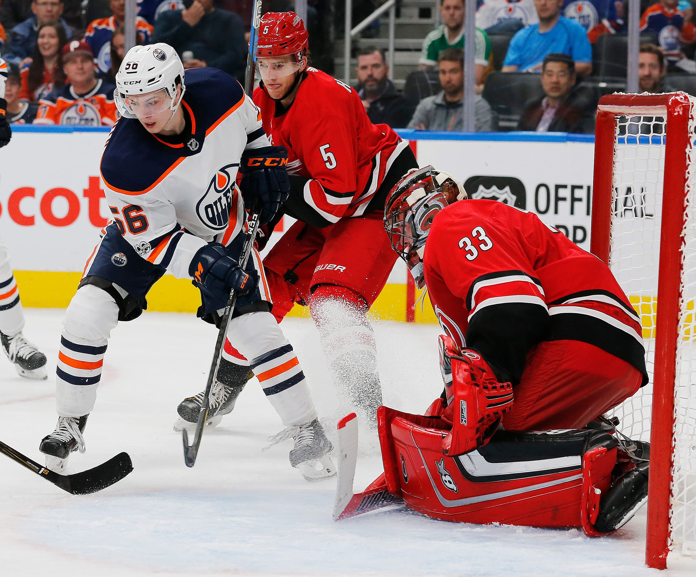 Sep 25, 2017; Edmonton, Alberta, CAN; Edmonton Oilers forward Kailer Yamamoto (56) looks for a loose puck in front of Carolina Hurricanes goaltender Scott Darling (33) during the third period at Rogers Place. Mandatory Credit: Perry Nelson-USA TODAY Sports