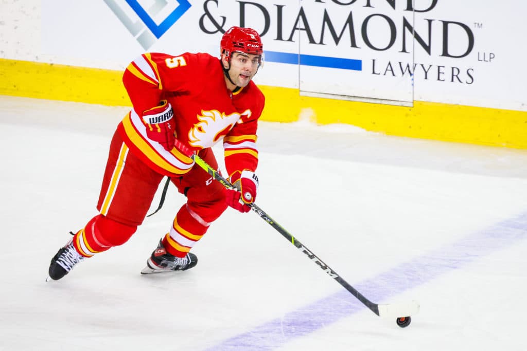 Apr 19, 2021; Calgary, Alberta, CAN; Calgary Flames defenseman Mark Giordano (5) controls the puck against the Ottawa Senators during the second period at Scotiabank Saddledome. Mandatory Credit: Sergei Belski-USA TODAY Sports