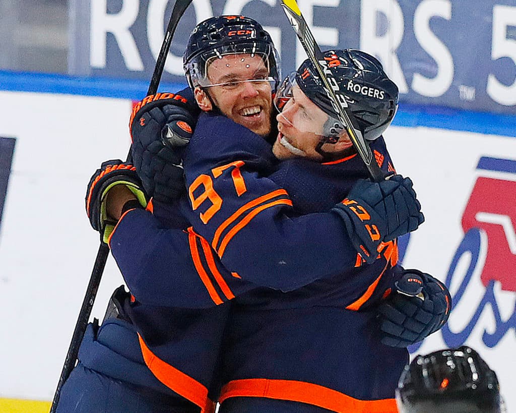 May 8, 2021; Edmonton, Alberta, CAN; Edmonton Oilers forward Connor McDavid (97) celebrates his 100th point of the season on a goal by forward Leon Draisaitl (29) against the Vancouver Canucks at Rogers Place. Mandatory Credit: Perry Nelson-USA TODAY Sports