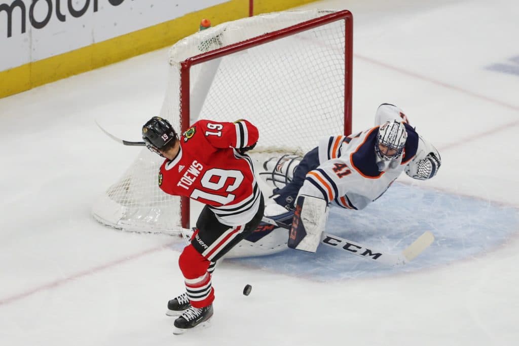 Mar 5, 2020; Chicago, Illinois, USA; Edmonton Oilers goaltender Mike Smith (41) defends against Chicago Blackhawks center Jonathan Toews (19) during the first period at United Center.