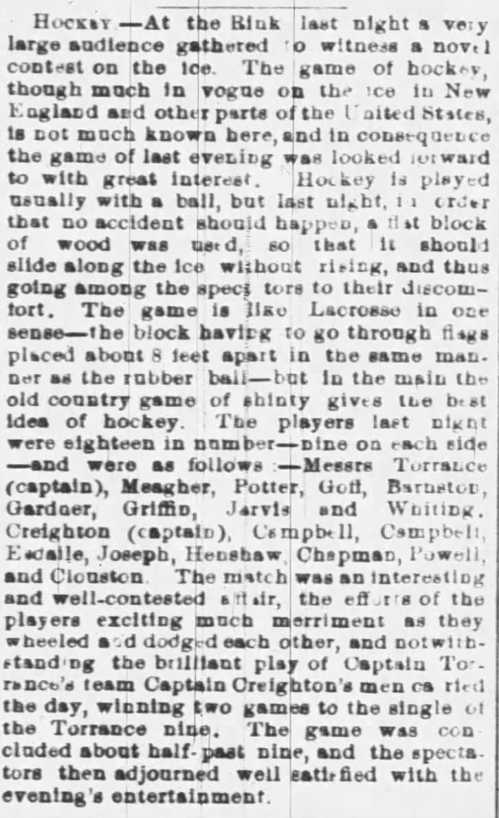 James G. A. Creighton, a McGill law student and later reporter for The Montreal Gazette, is believed to be the one who helped organize the game. Held in Montreal’s Victoria Skating Rink, the match featured nine men per side and saw “notwithstanding the brilliant play of Captain Torrance’s team Captain Creighton’s men carried the day, winning two games to the single of the Torrance nine.”