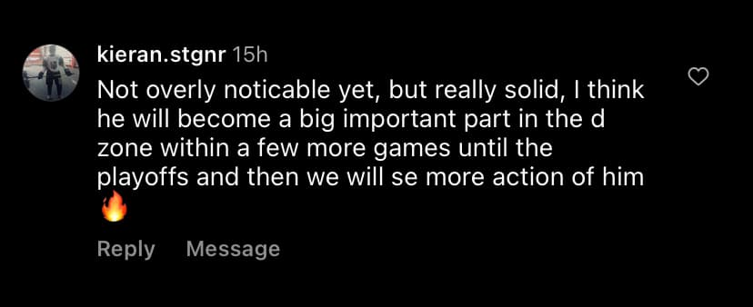 Nancy is referring to the second matchup against Winnipeg this past weekend. Not only has the defensive side of his game been noticeable but the way he can move the puck. I’m sure Connor McDavid has loved his handling of the puck thus far.
