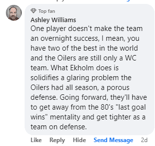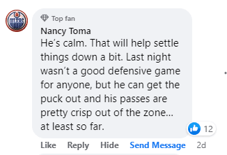 Ashley with a nice critique. Ekholm does solidify the problem where the Oilers lacked someone who can defend consistently and get the puck out of his zone. And I agree with Ashley, it’s time this team tries to stop out-scoring the defensive lapses and hold onto leads. Not letting teams back into the game. Tighter team defense will result in fewer headaches the next day.