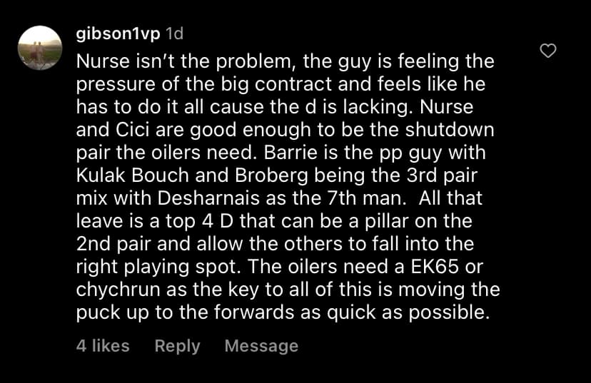It’s very rare to see someone not pin the blame on Darnell Nurse. Gibson mentions how the pressure of the big contract has gotten to Nurse. Bringing in a guy like Karlsson, which is highly unlikely at this point would solve a few issues. Does the same go for Chychurn?! A player who can take the focus and attention off Darnell Nurse and is more responsible with the puck?! I believe a puck mover like Karlsson or Jakob Chychrun would be the answer.