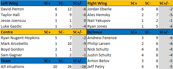 Exactly one member of the Edmonton Oilers was on the ice for more chances for than against versus Vancouver. It was Boyd Gordon, who saw the ice for two Oilers chances to one against. Otherwise, it was pretty ugly: